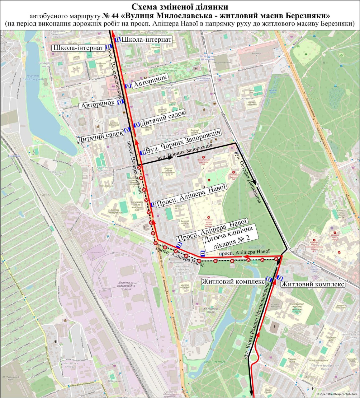 - від вул. Милославської до просп. Воскресенського за власним маршрутом, далі вул. Чорних Запорожців – вул. Остафія Дашкевича – просп. Алішера Навої – вул. Князя Романа Мстиславовича – далі за власним маршрутом.