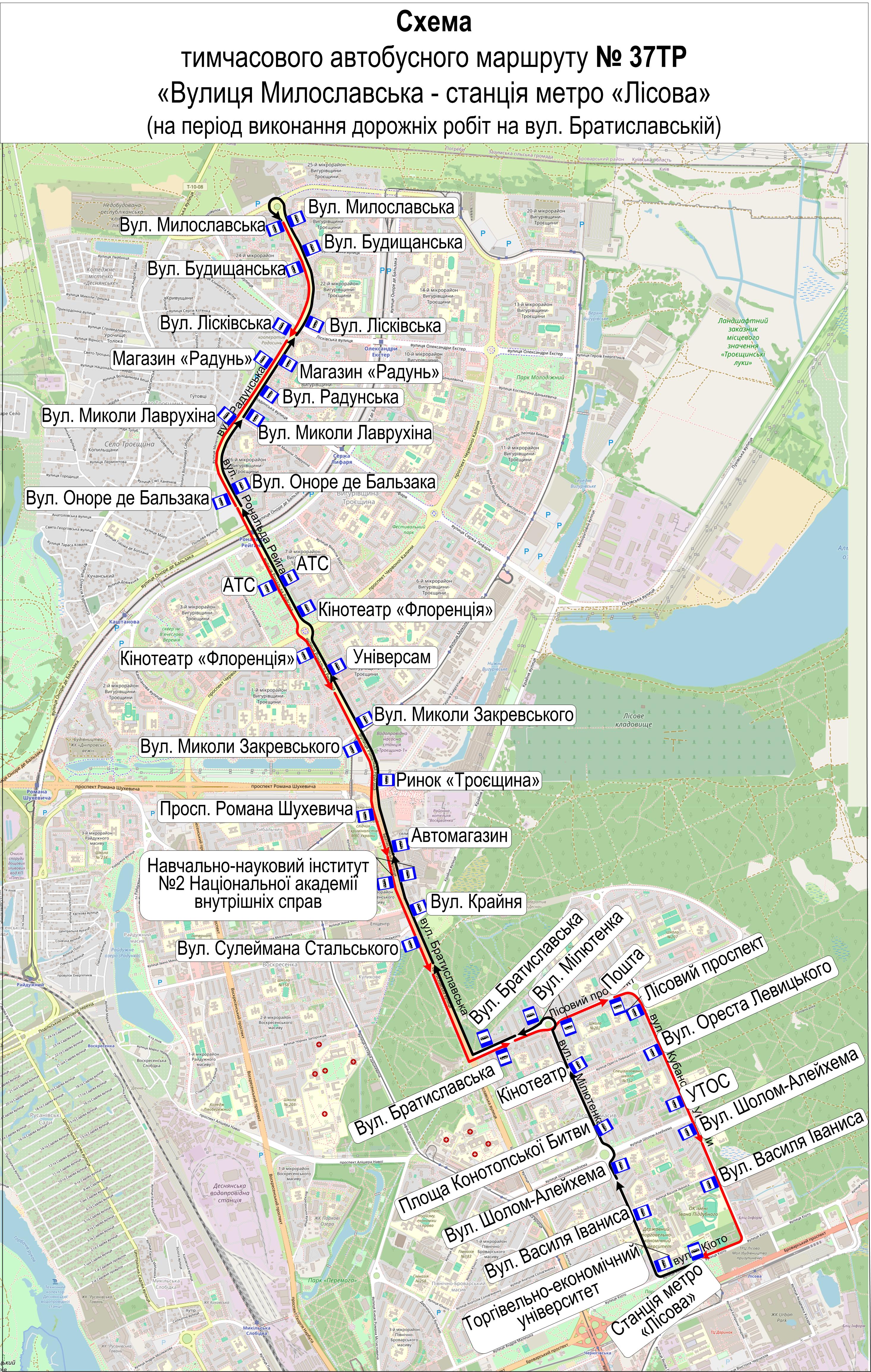 Також для перевезення пасажирів з 10:00 до 16:00 від вул. Милославської до ст. м. «Лісова» за маршрутом тролейбусів № 37 організують тимчасовий автобусний маршрут № 37-ТР.