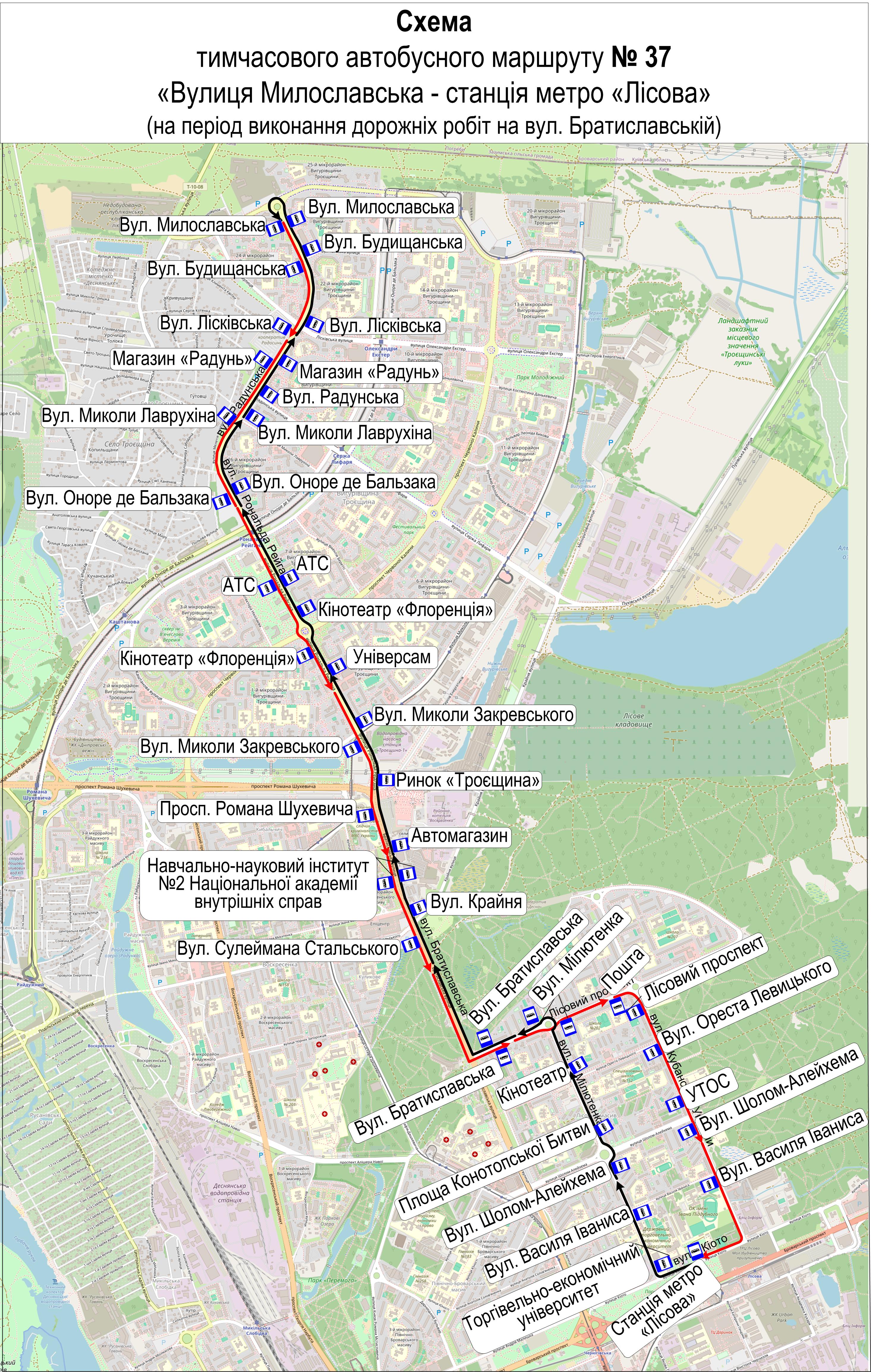 Також для перевезення пасажирів з 9:00 до 16:30 від вул. Милославської до ст. м. «Лісова» за маршрутом тролейбусів № 37 організують тимчасовий автобусний маршрут № 37-ТР.