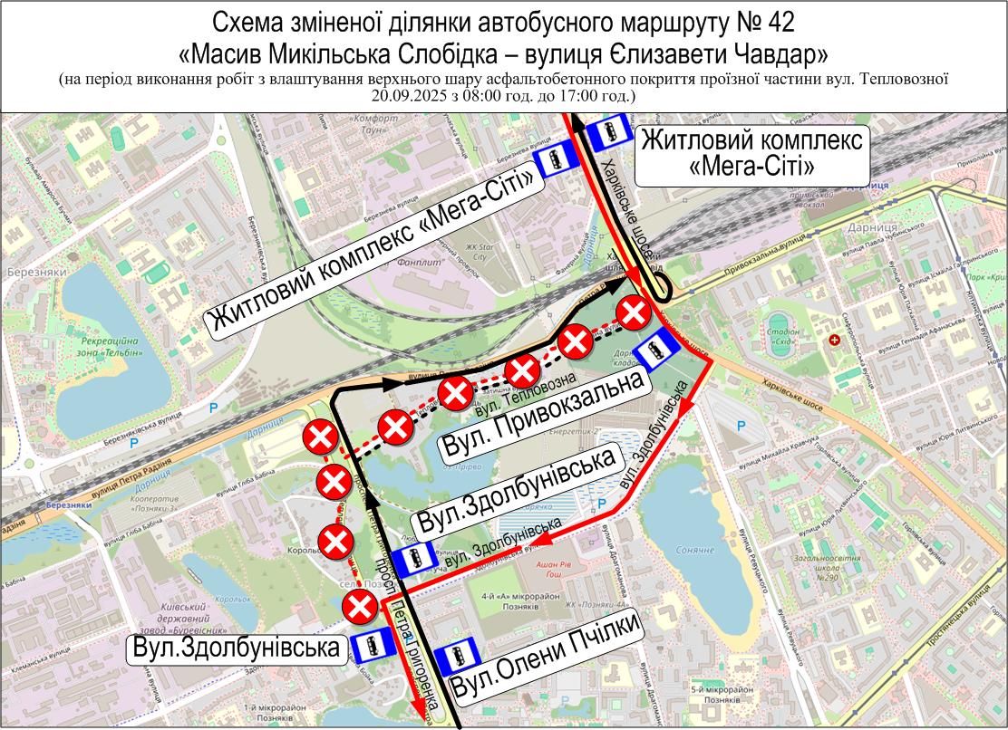 маршрут № 42 − від житлового масиву Микільська Слобідка до Харківського шосе за власним маршрутом, далі – вул. Здолбунівська – просп. Петра Григоренка (в зворотному напрямку – просп. Петра Григоренка – Дарницьке шосе – Харківське шосе) – вул. Анни Ахматової – вул. Урлівська – вул. Княжий Затон – Дніпровська набережна – вул. Єлизавети Чавдар – вул. Софії Русової;