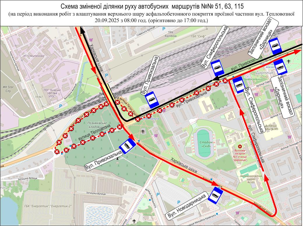 20 вересня автобуси № 42, 51, 63, 115 курсуватимуть зі змінами руху через дорожні роботи на вул. Тепловозній (+схеми)