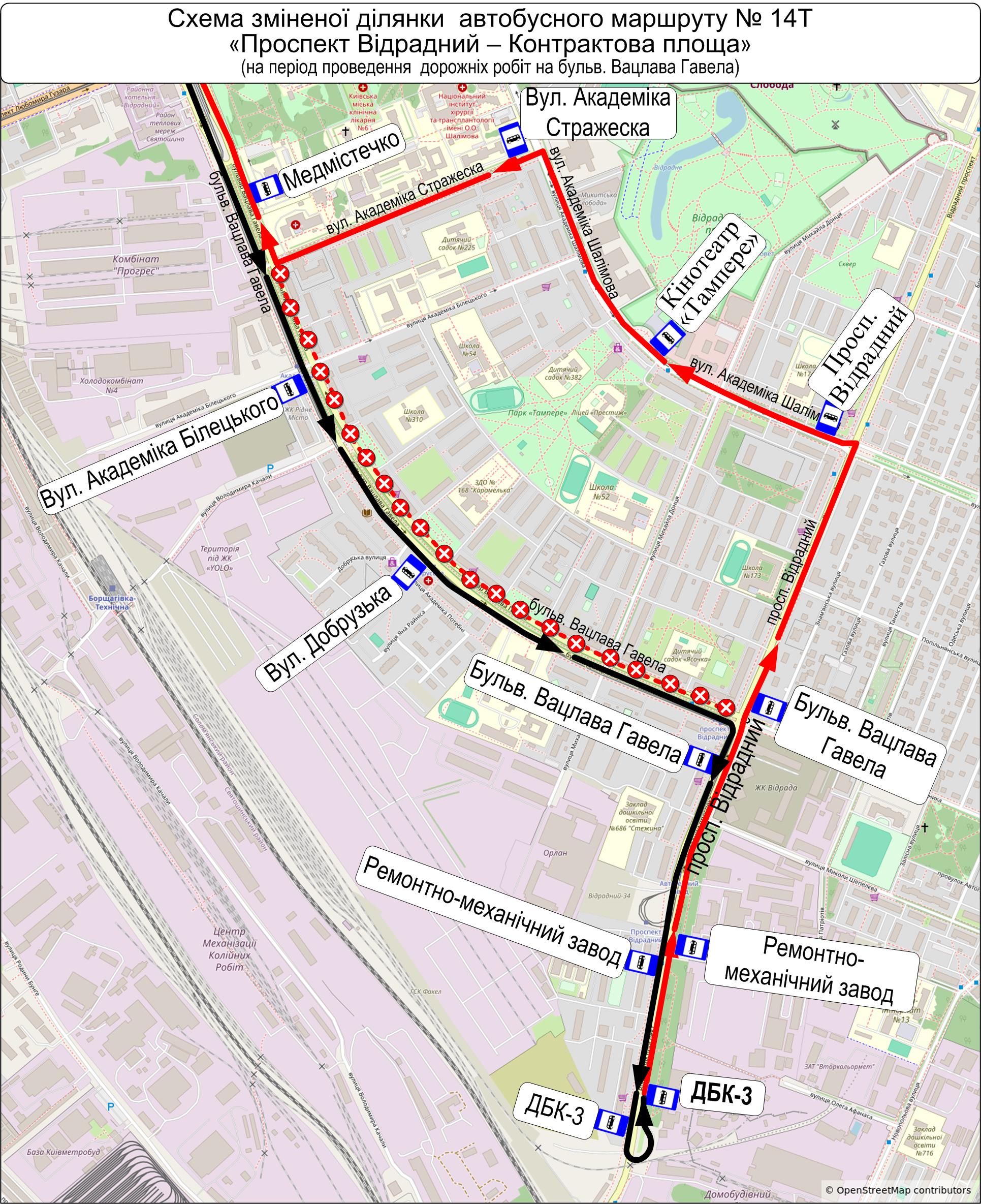 Так, із 8:00 до 18:00, автобуси № 14-Т у напрямку Контрактової площі курсуватимуть: просп. Відрадний – вул. Академіка Шалімова – вул. Академіка Стражеска – бульв. Вацлава Гавела, далі за власною схемою до Контрактової площі. У зворотному напрямку без змін.