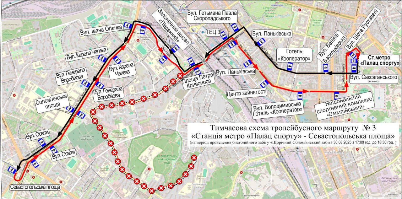 Завтра, 30 серпня, внесуть зміни в маршрути тролейбусів №№ 3, 40 у зв’язку з проведенням благодійного заходу «Щорічний Солом’янський забіг». Про це повідомляють у КП «Київпастранс».
