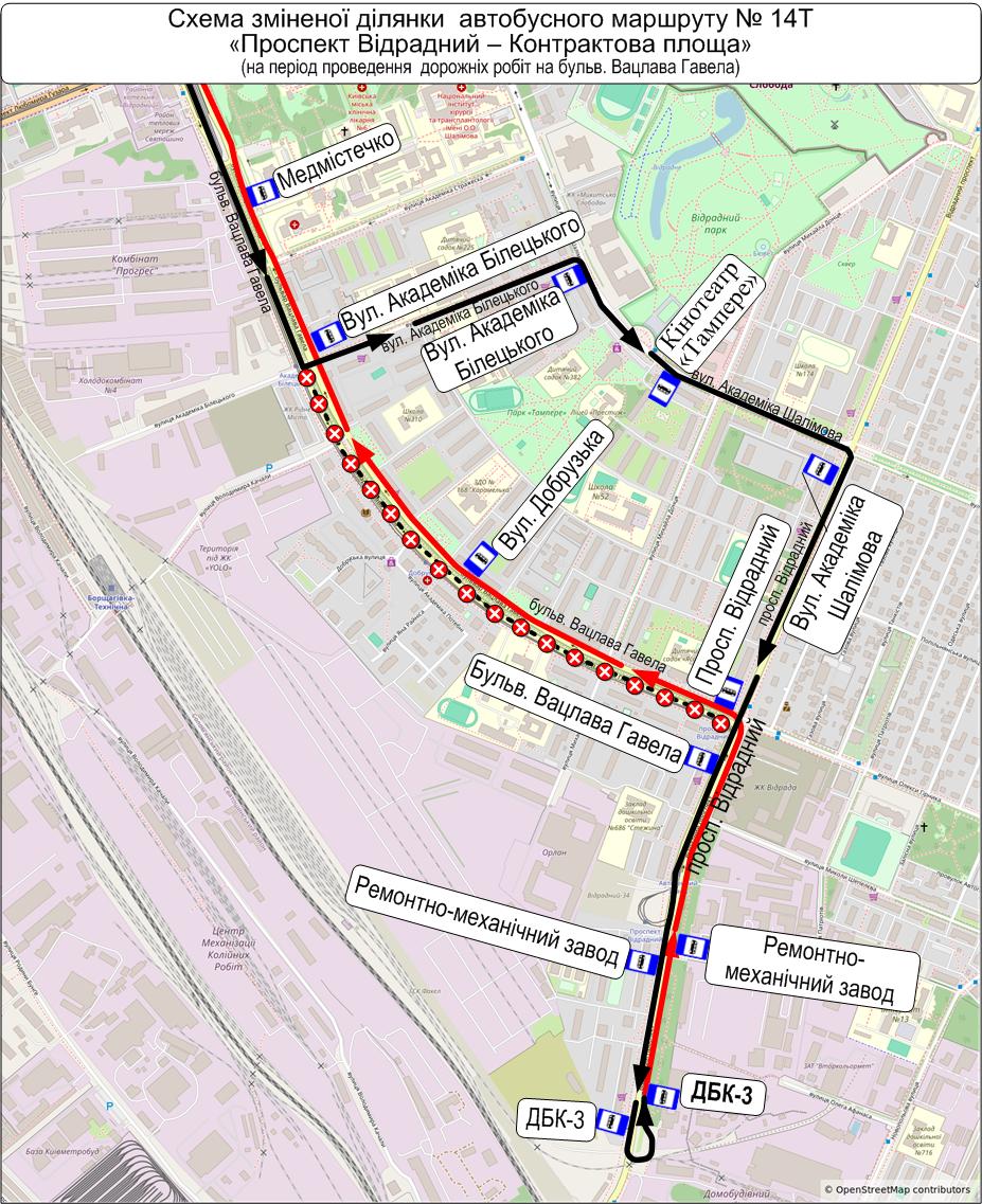 Автобуси № 14Т у напрямку просп. Відрадного курсуватимуть від станції метро «Контрактова площа» до бульв. Вацлава Гавела (перехрестя з вул. Академіка Білецького) за власним маршрутом, далі – вул. Академіка Білецького – вул. Академіка Шалімова – просп. Відрадний, далі за власним маршрутом. У зворотному напрямку без змін.