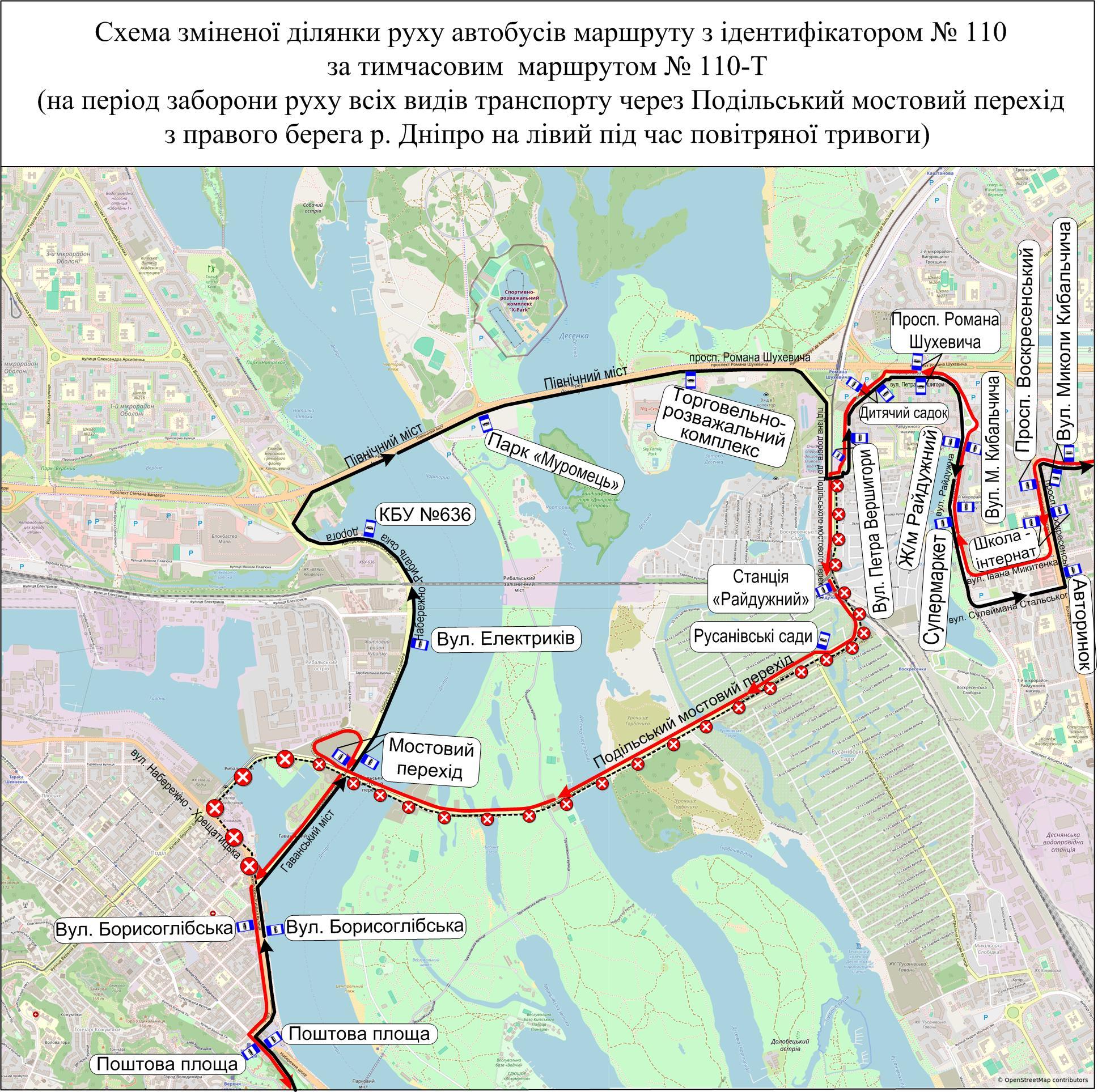 - № 110-Т – пл. Українських Героїв – вул. Гетьмана Павла Скоропадського – вул. Володимирська – бульв. Тараса Шевченка – вул. Хрещатик – Володимирський узвіз – Боричів узвіз – вул. Набережно-Хрещатицька – Гаванський міст – вул. Набережно-Рибальська – Північний міст – просп. Романа Шухевича – під’їзна дорога до Подільського мостового переходу – вул. Петра Вершигори – вул. Райдужна – вул. Сулеймана Стальського – просп. Воскресенський – вул. Миколи Кибальчича – просп. Романа Шухевича – вул. Рональда Рейгана – вул. Миколи Закревського – вул. Сержа Лифаря – вул. Градинська – вул. Радунська – вул. Лісківська – вул. Милославська – пл. Героїв Чернігова.