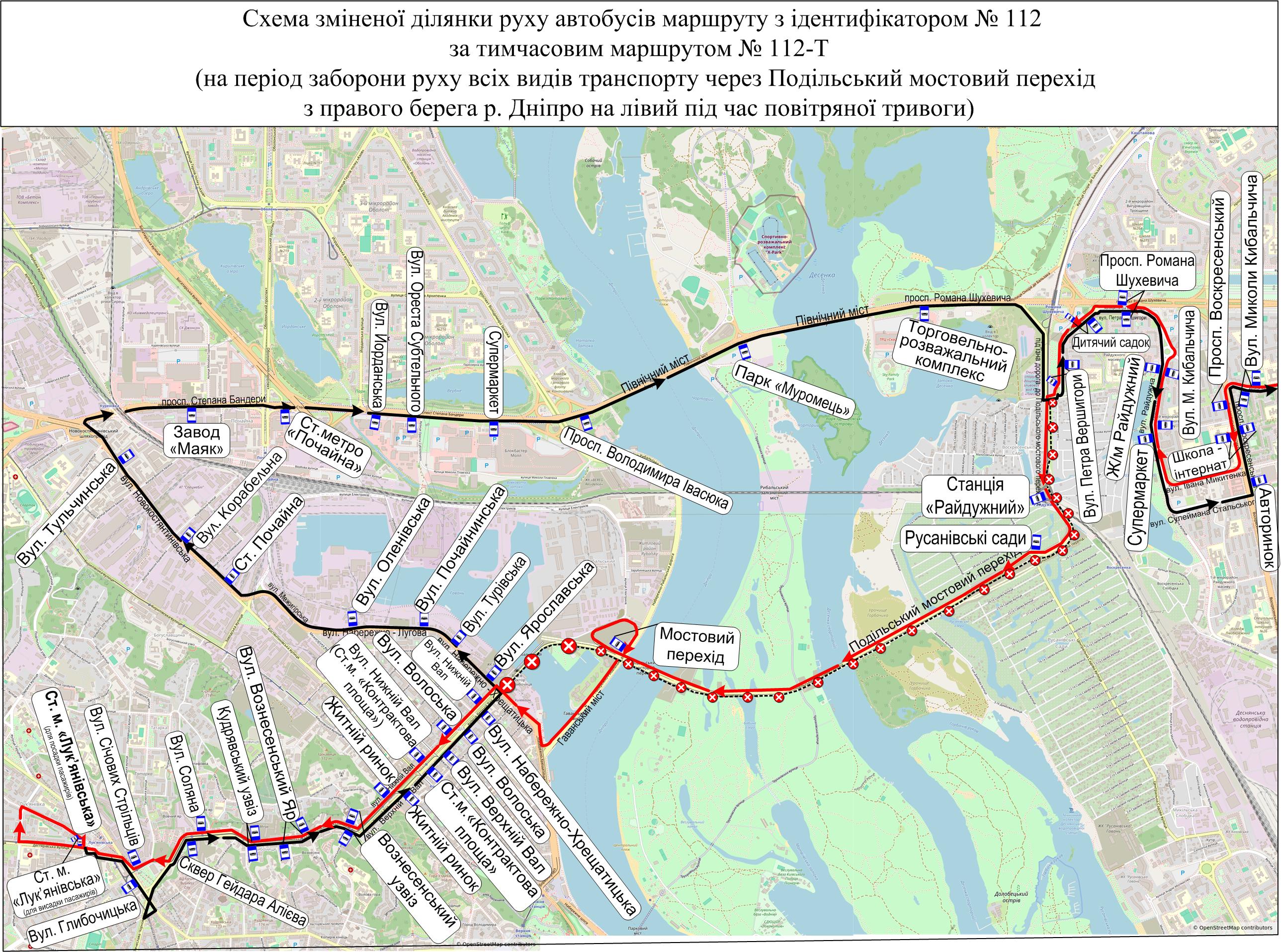 - № 112-Т – вул. Дегтярівська – вул. Юрія Іллєнка – вул. Січових Стрільців – вул. Глібова – вул. В’ячеслава Чорновола – Глибочицький проїзд – вулиця Глибочицька – вул. Верхній Вал – вул. Набережно-Хрещатицька – вул. Набережно-Лугова – вул. Межигірська – вул. Новокостянтинівська – просп. Степана Бандери – Північний міст – просп. Романа Шухевича – під’їзна дорога до Подільського мостового переходу – вул. Петра Вершигори – вул. Райдужна – вул. Сулеймана Стальського – просп. Воскресенський – вул. Миколи Кибальчича – вул. Ірини Бекешкіної – вулиця Івана Микитенка.