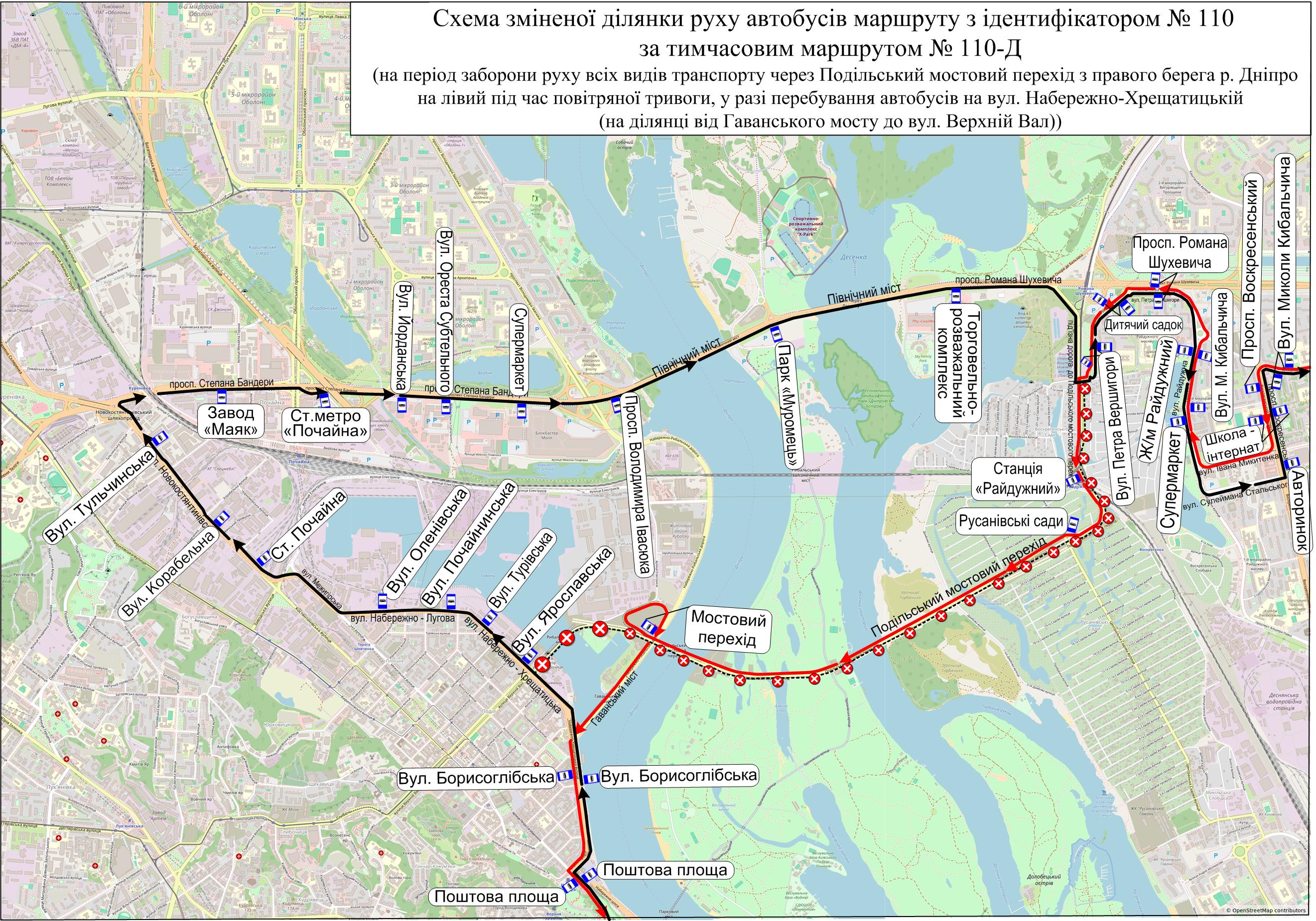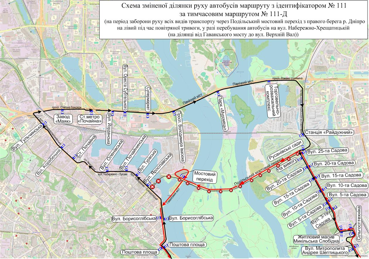 Якщо на момент оголошення повітряної тривоги автобуси № 110 та № 111 перебуватимуть на вул. Набережно-Хрещатицькій (на ділянці від Гаванського мосту до вул. Верхній Вал), вони продовжать рух за іншою схемою під номерами № 110-Д та № 111-Д відповідно: