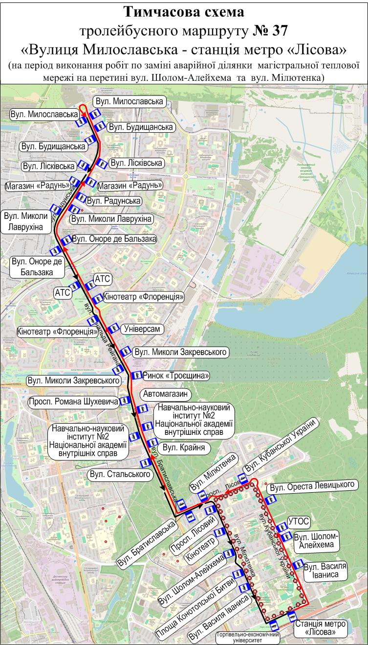 - тролейбус № 37 – від вул. Милославської до просп. Лісового за власним маршрутом, далі – вул. Мілютенка – вул. Кіото – вул. Кубанської України – просп. Лісовий (за маршрутом тролейбусів № 37-А), далі за власним маршрутом до вул. Милославської.