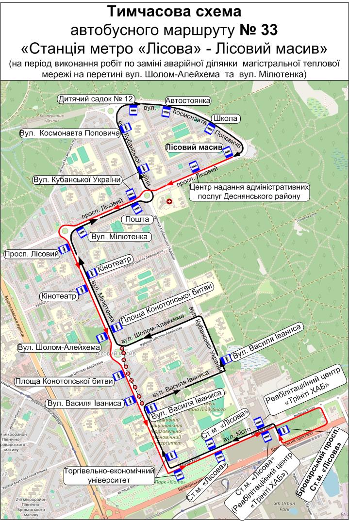 - автобус № 33 – від станції метро «Лісова» до вул. Мілютенка за власним маршрутом, далі – вул. Василя Іваниса – вул. Кубанської України – вул. Шолом-Алейхема – вул. Мілютенка, далі за власним маршрутом. У зворотному напрямку без змін;