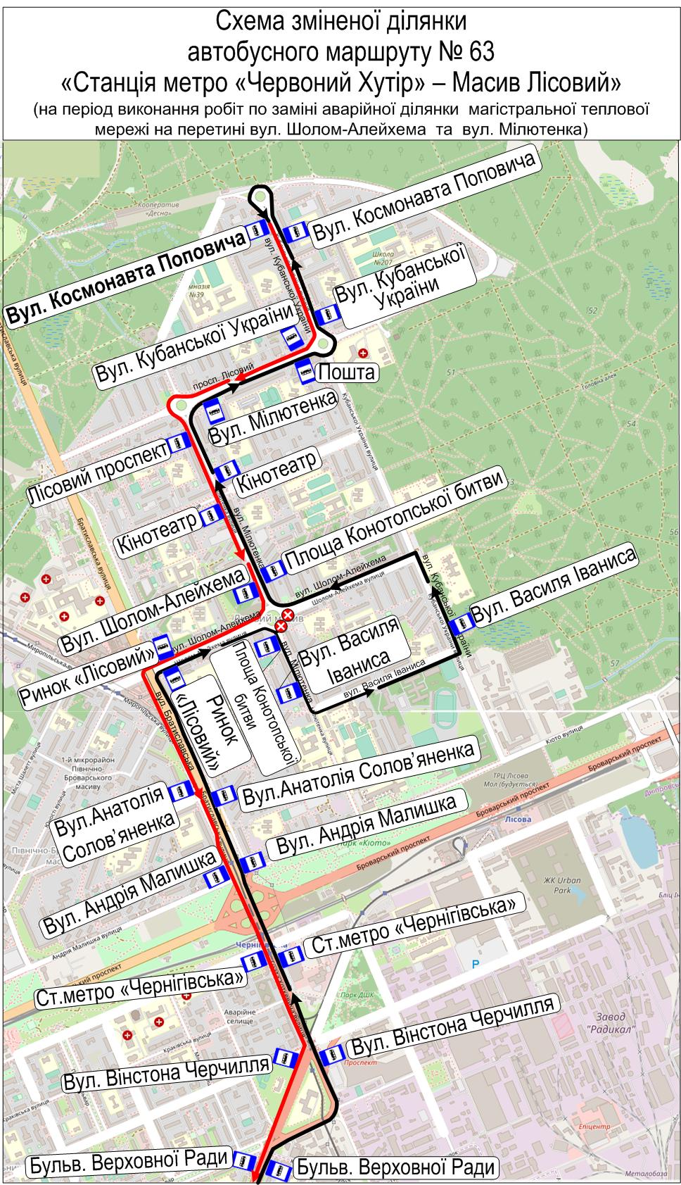 - автобус № 63 – від станції метро «Червоний Хутір» до вул. Шолом-Алейхема за власним маршрутом, далі – вул. Мілютенка – вул. Василя Іваниса – вул. Кубанської України – вул. Шолом Алейхема – вул. Мілютенка, далі за власним маршрутом. У зворотному напрямку без змін.