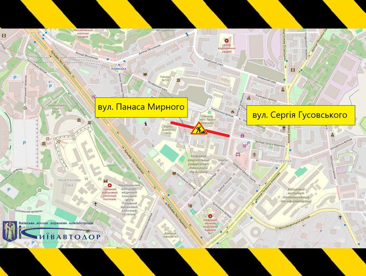 КП ШЕУ Печерського району проводитимуть поточний ремонт вулиці на ділянці від вул. Сергія Гусовського до вул. Панаса Мирного, 19. На час проведення робіт рух транспорту частково обмежуватимуть.