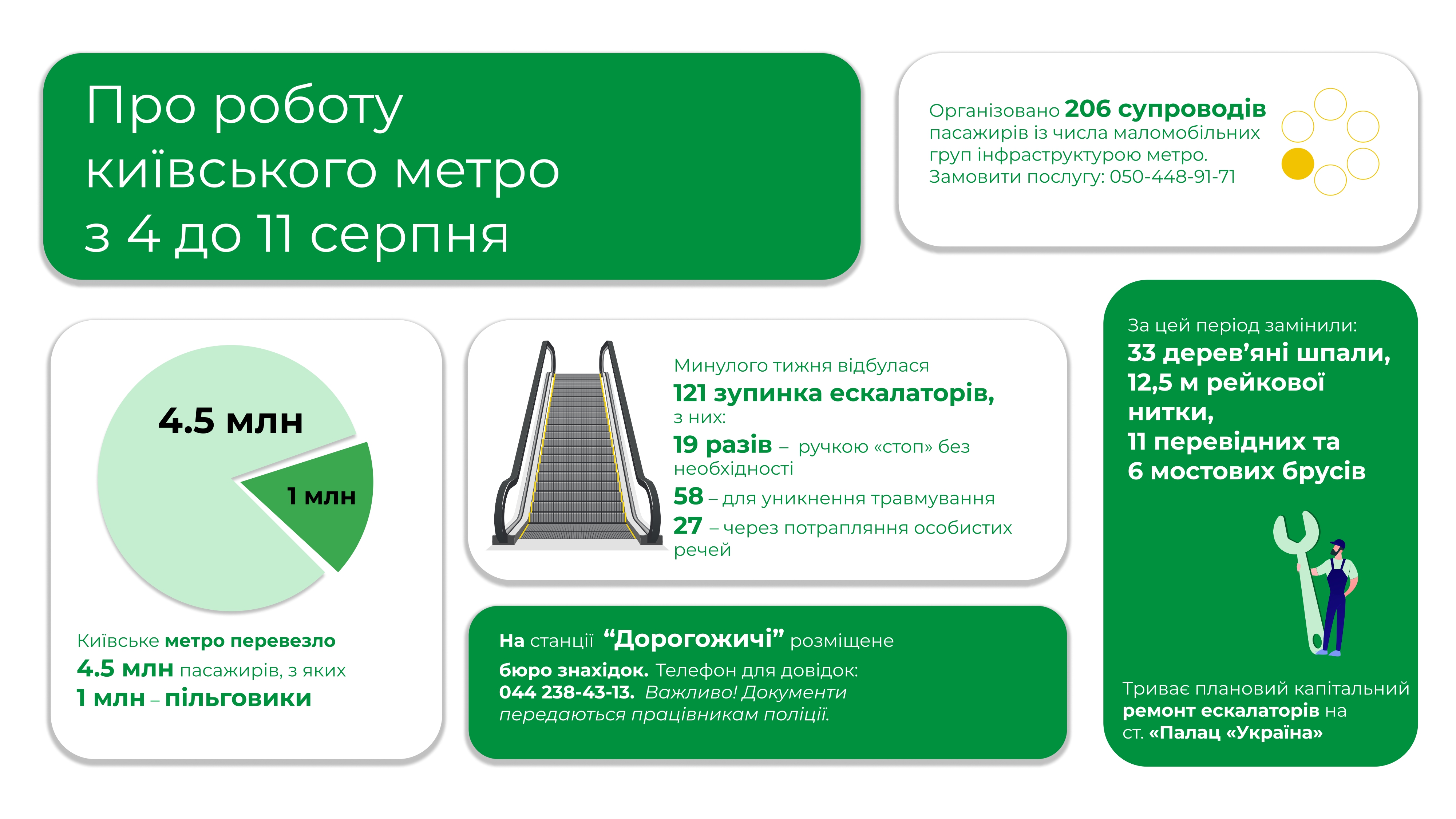 Також у цей період фахівці організували 206 супроводів пасажирів із числа маломобільних груп інфраструктурою метрополітену. Для замовлення супроводу необхідно зателефонувати за номером (044) 238-55-11 або 050-448-91-71 і повідомити маршрут поїздки в метрополітені. У підприємстві рекомендують телефонувати за годину до запланованої поїздки, аби працівник метро очікував біля початкової станції.