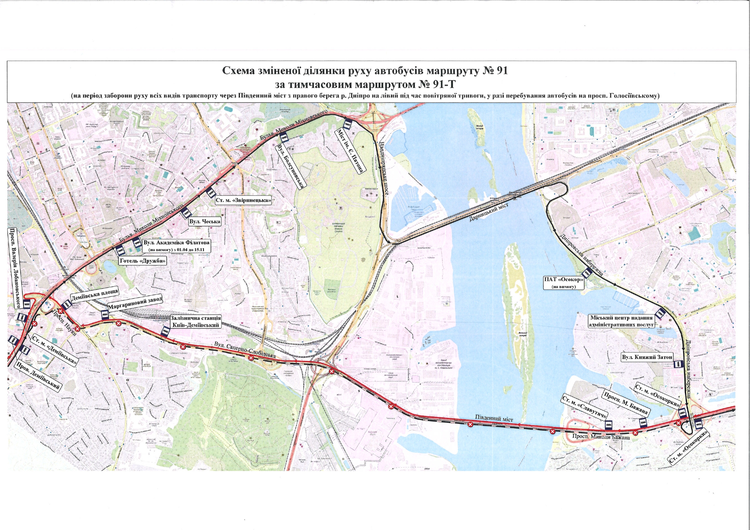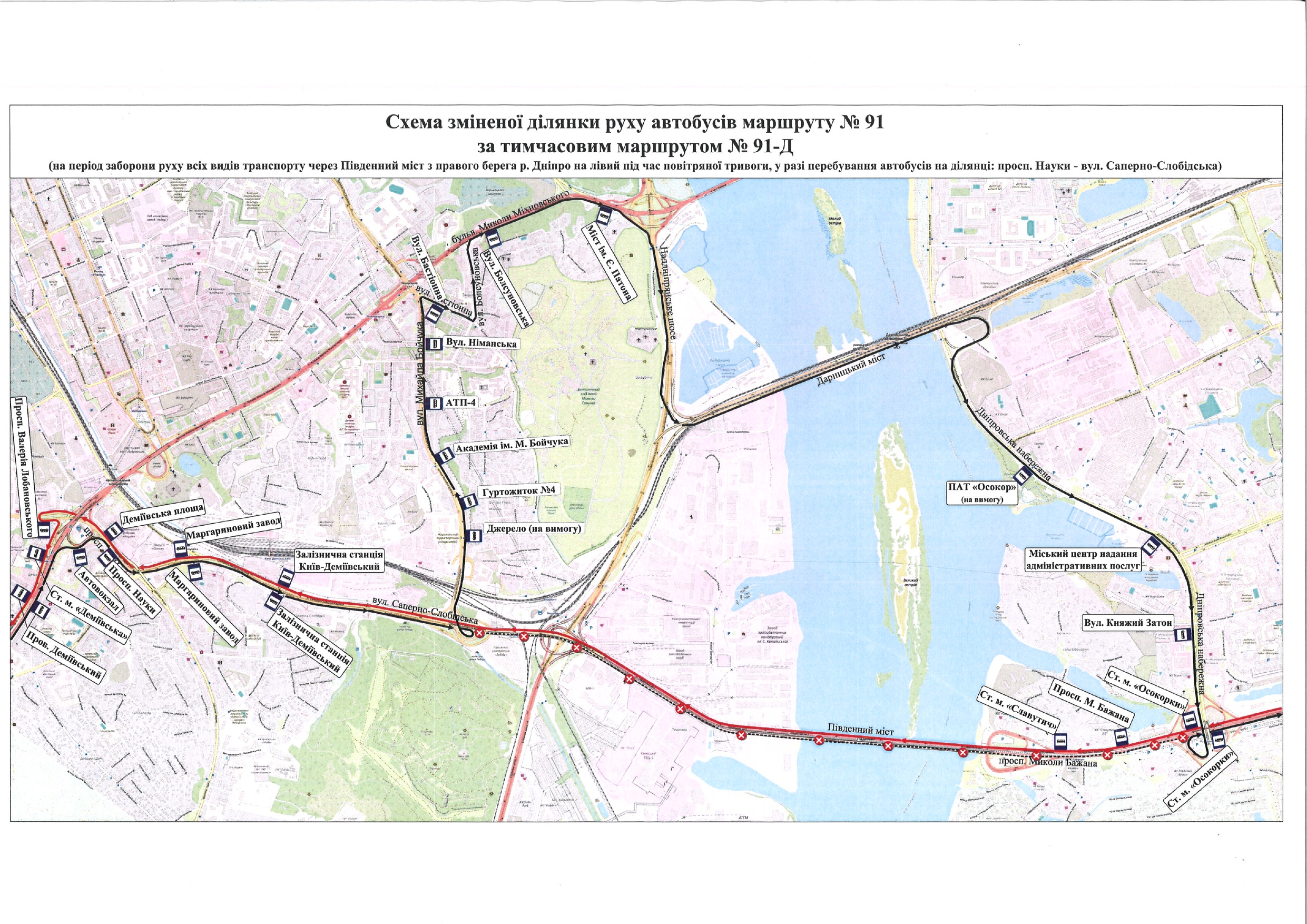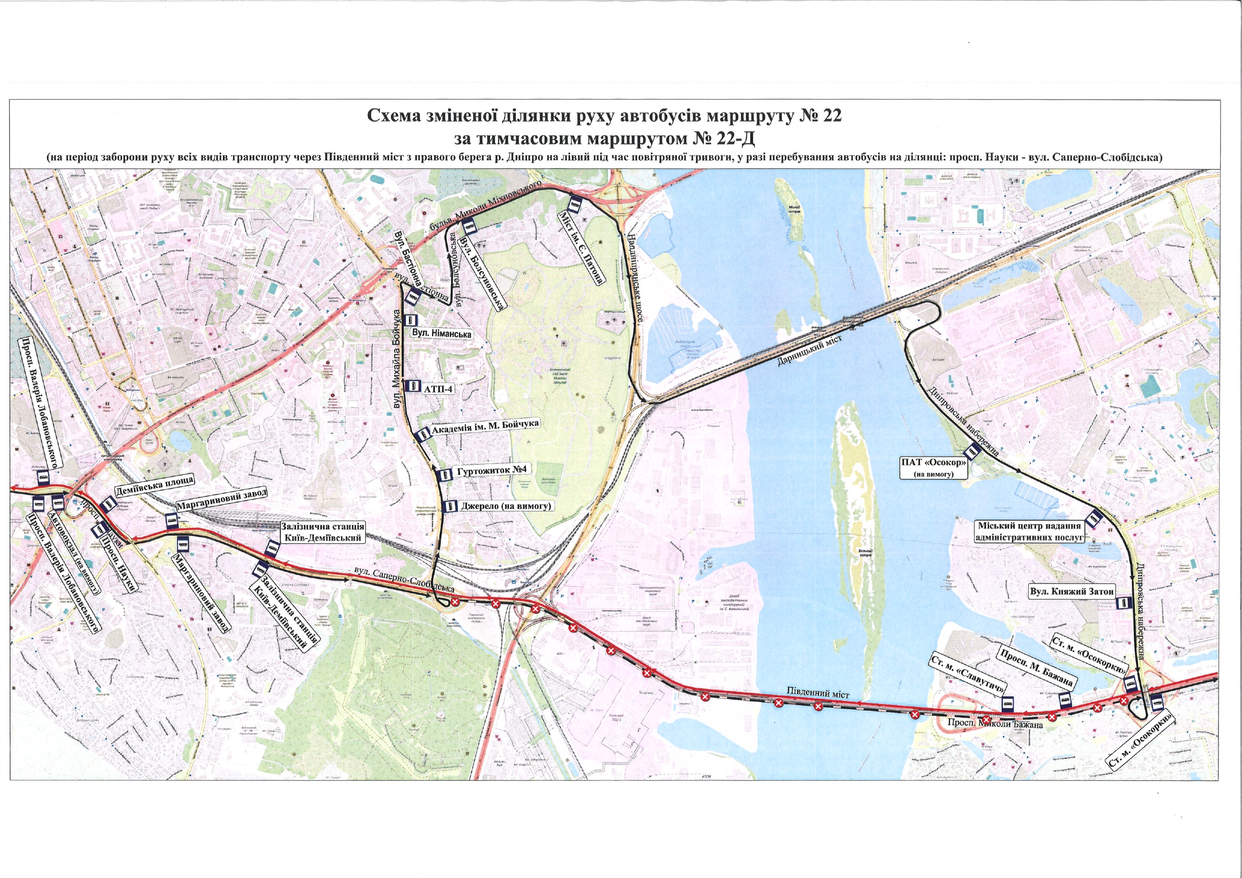 У зв’язку з цим, за інформацією Департаменту транспортної інфраструктури, під час повітряної тривоги та в разі, коли патрульна поліція запроваджує тимчасову заборону руху транспорту Південним мостом із правого берега Дніпра на лівий, автобуси № 22 та № 91 курсуватимуть за зміненими схемами.