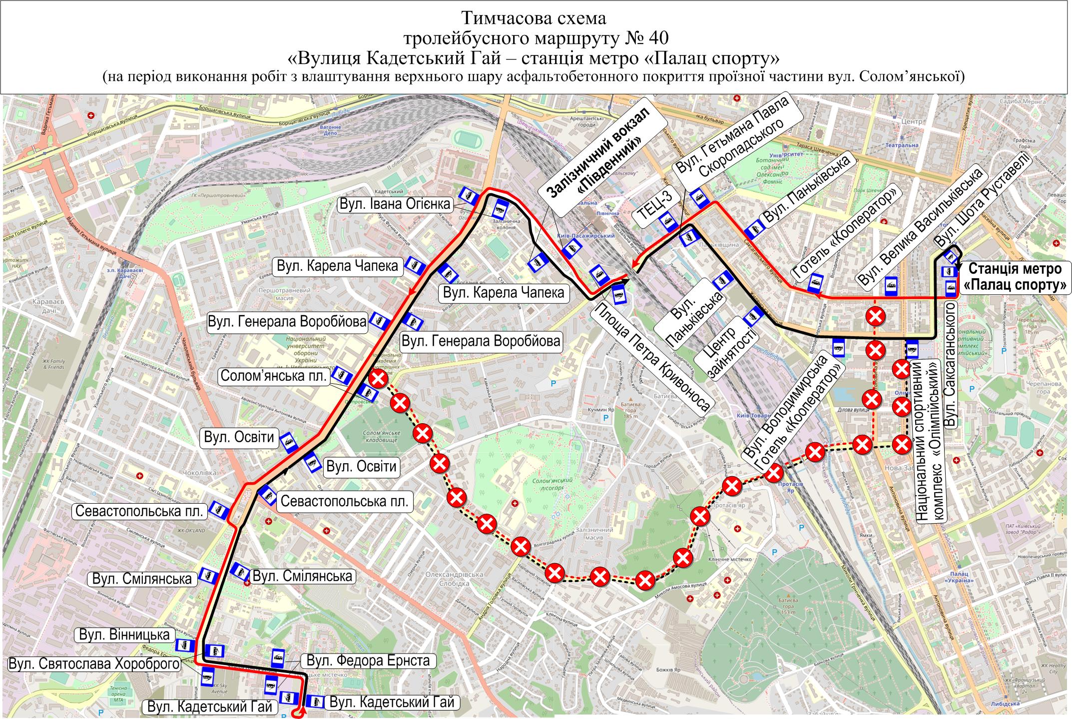 Зокрема, 21 та 22 вересня тролейбуси № 40 курсуватимуть від вул. Кадетський Гай до Солом’янської площі за власним маршрутом, далі просп. Повітряних Сил – вул. Івана Огієнка – вул. Георгія Кірпи (у зворотному напрямку – вул. Січеславська) – вул. Січеславська – вул. Митрополита Василя Липківського – вул. Гетьмана Павла Скоропадського – вул. Жилянська (у зворотному напрямку вул. Саксаганського) – вул. Шота Руставелі – далі за власним маршрутом до станції метро «Палац спорту» (за маршрутом тролейбусів № 9-К);