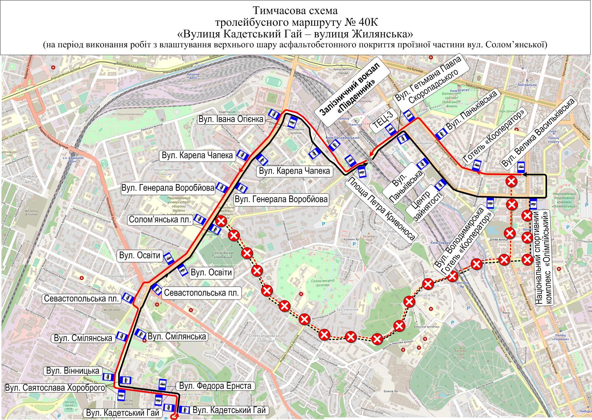 22 вересня тролейбуси № 40-К курсуватимуть від вул. Кадетський Гай до Солом’янської площі за власним маршрутом, далі – просп. Повітряних Сил – вул. Івана Огієнка – вул. Георгія Кірпи (у зворотному напрямку – вул. Січеславська) – вул. Січеславська – вул. Митрополита Василя Липківського – вул. Гетьмана Павла Скоропадського – вул. Жилянська (у зворотному напрямку – вул. Саксаганського).